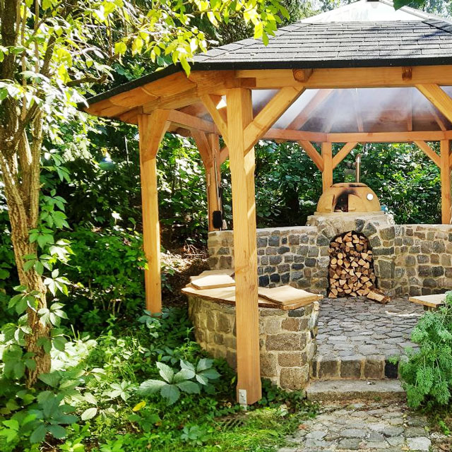 There are pod houses in the garden—cozy, heated wooden round huts. Showers, washbasins, and toilets are conveniently located nearby in the Engelscheuer.