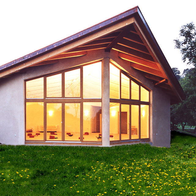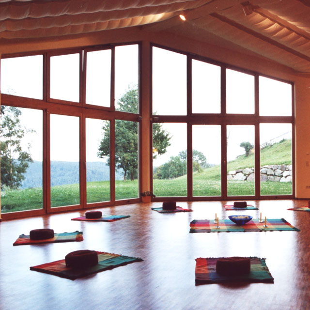 Der Gruppenraum mit bodentiefer Fensterfront zum Garten und einem geöltem Kirschbaumparkett mit Fußbodenheizung ist ideal für unsere Workshops, der Raum ist hell, offen und klar.