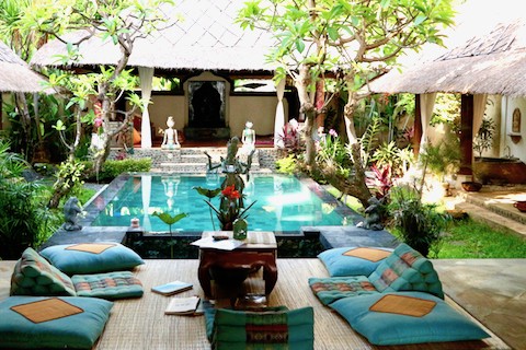 Das Seminarhaus Prana Veda verfügt über einen Seminarraum mit Blick über den Garten bis zum Meer. Die geschmackvoll eingerichteten Zimmer sind ein balinesischer Traum mit kunstvoll geschnitzten Himmelbetten und Möbeln.